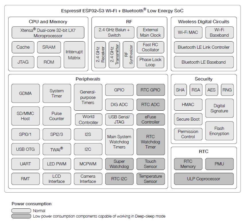 The ESP32-S3 is one of the best microcontrollers of Espressif that incorporates a double core XTensa LX7, capable of running up to 240MHz. In addition, it integrates 2.4GHz connectivity with support for WiFi and Bluetooth LE. In the following image you can see the functional diagram of the ESP32-S3 with all the peripherals it incorporates: