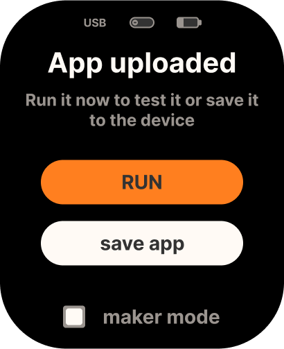 Depending on whether the maker mode is activated or not, the code you upload will run automatically or not. If the maker mode is activated, you will see a pop-up with a countdown of 3 seconds until the code runs. You can cancel the countdown and cancel the execution. If the maker mode is deactivated, the code will not run automatically and you can run it whenever you want by pressing the run button.Create an application