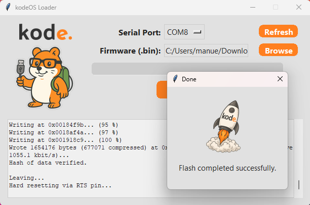 kodeOS is the operating system that runs on a partition of the flash of your Kode Dot. If for some reason you erase the flash or program a code on top of the kodeOS partition, you can reinstall it through the kode desktop application.